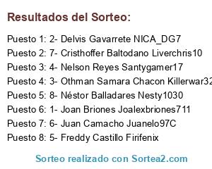 Lista de participantes: 1- Joan Briones Joalexbriones711, 2- Delvis Gavarrete NICA_DG7, 3- Othman Samara Chacon Killerwar326, 4- Nelson Reyes Santygamer17, 5- Freddy Castillo Firifenix, 6- Juan Camacho Juanelo97C, 7- Cristhoffer Baltodano Liverchris10, 8- Néstor Balladares Nesty1030.