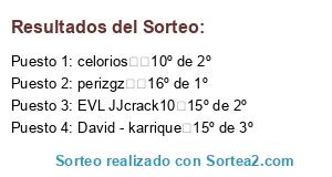 Lista de participantes: celorios 10º de 2º, EVL JJcrack10 15º de 2º, David - karrique 15º de 3º, perizgz 16º de 1º.