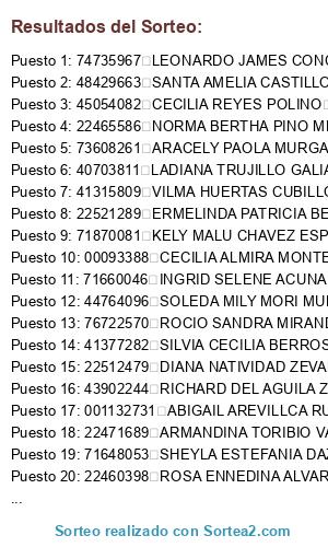Lista de participantes: 001132731 ABIGAIL AREVILLCA RUFINO 016, 45913774 ADA DAMARIS UGARTE ARRATEA 016, 75003898 ALEXSANDRA YANIRA FERRER ROJAS 012, 41601609 ALFREDO VALOIS DOMINGUEZ ROSALES 009, 22504560 ALICIA ELIZABETH ACOSTA OLIVER 014, 46259049 ALINA DANIELA AVILA DIAZ 016, 22489035 ANA SILVIA BASILIO CHAVEZ 006, 46853063 ANGELICA CABRERA ALBORNOZ 006, 48730684 ANGI DAYANA ZEVALLOS PRESENTACION 014, 45132214 ANTONIO CESAR TORRES CANZAYA 004, 76208912 ARACELI MISHELL VIDAL ENCARNACION 016, 73608261 ARACELY PAOLA MURGA CORI 019, 22471689 ARMANDINA TORIBIO VALENTIN 016, 48665601 ASTRID KAROLINA MALPARTIDA MALPARTIDA 009, 71974671 ASTRID YASMIN TELLO RAMIREZ 010, 22879760 ASUNCIONA ARANGO ORTEGA 016, 22484746 AURELIA FALCON PINAN 008, 75445267 AYDA DORINA LEANDRO AQUINO 017, 40489636 AYLENSY RIBERA RAMIREZ 006, 04014916 BAUTA AQUILH CARHUAZ VALENTIN 013, 75015188 BEATRIZ GOMEZ LEANDRO 016, 43222716 BEATRIZ MELANY GUILLERMO CASTILLO 006, 47620414 BERENICE VALERIA AGUI BECERRA 016, 06279096 BERTHA GLADYS NIEVES VELA 012, 22414062 BERTHA ORDONEZ LEON 014, 72264476 BETHS SEMIRA ABAD BERROSPI 016, 73261308 BETY SAIDA PIMENTEL YUMPE 009, 47810103 BEVERLYNG JULISSA SANCHEZ QUIJANO 008, 40790281 BLANCA ROSA ALVA DURAN 011, 22415970 CARMEN DIAZ INGUNZA 006, 44555342 CARMEN FABIAN NOLASCO 004, 00093388 CECILIA ALMIRA MONTECILLO SANTIBANEZ 010, 45054082 CECILIA REYES POLINO 006, 22404218 CECILIA RIVERA LOPEZ 012, 23182610 CELSA TOLENTINO AROSTEGUI 005, 77273883 CIELITA ELVIA GONZALES FIGUEREDO 009, 44559967 CRISLY FIORELLA DEL CASTILLO TRUJILLO 019, 73608026 CRISTINA ESTEBAN 019, 76196495 DALIA SONNIA CIPRIANO CAYETANO 013, 48097434 DALILA ALEJO JACINTO 014, 22883235 DALILA INES SALINAS PALOMINO 016, 72229973 DAMARIS MAIZ DAGA 016, 41798672 DENCY ORTIZ PONCIANO 006, 73801921 DEYSSI MELINA PINTO SEPION 004, 44782984 DIANA BLAS SEFERINO 010, 22507309 DIANA ESTHER SOTO COZ 013, 41086178 DIANA LIZBETH DAZA PEREZ 007, 22512479 DIANA NATIVIDAD ZEVALLOS DIOSES 013, 22742266 DIGNA MACCHA SALAZAR 019, 46384680 DINA LIZBET GOMEZ CARPIO 017, 22479662 DIOSA LINDA ASENCIO GONZALES 017, 22999863 DORA CLEMENTE PONCE 013, 47025708 DORIS PRUDENCIO ROMAN 013, 10560901 ELENA OBREGON HOYOS 008, 22418332 ELISA DEL PILAR TABOADA BOLARTE 012, 41152219 ELIZABETH ANTONIA MARCHAN VALVERDE 008, 40891003 ELIZABETH RIVERA ROSEL 008, 22487486 ELSA EDY ORIZANO LEIVES 013, 41974842 EMILIA ENCARNACION GUERRA PAZ 011, 44342676 ENY GABY DIAZ SALGADO 006, 80001684 ERICA VANESSA SINTI PARAGUA 017, 22521289 ERMELINDA PATRICIA BERNARDO CORI DE TINTA 006, 74657368 ESTALITA ALIDA BENANCIO GREGORIO 007, 72102835 ESTHER MOLINA CORPUS 019, 00996361 ESTHER SAAVEDRA JARAMILLO 017, 72295141 ESTRELLA LUCERO NUNEZ VELEZ DE VILLA 013, 22414183 EUDOLINDA ELIZABETH JERONIMO ROSALES 013, 44962711 EULALIA AMELIA FABIAN RECINAS 017, 62002584 EVA LUZ JAVIER AGUERO 012, 42687593 FATIMA ELEXIMIA MONTERO FOLLEGATI 019, 42914866 FEDERICO GILBERTO MIRANDA PINEDA 007, 45975454 FLOIDA CLUSYOLA SOBRADO PINEDA 007, 40076863 FLOR MELINA SACHUN GARCIA 006, 22461307 FLORINDA GONZALES VENTURO 012, 45009561 FRANCISCA LEANDRO PICON 019, 22503135 FRIDA VERONICA MARRUJO ORBEZO 010, 70182178 GABY CECILIA IBARRA NORENA 010, 43960434 GEOVANNA TORRES CANZAYA 002, 22489566 GINA DEL PILAR MAURICIO ENCARNACION 008, 22474224 GLADIS OTILIA SOLORZANO ARMAS 001, 43591643 GLADYS CELINA ZUNIGA TOLENTINO 010, 43494041 GLADYS PRUDENCIO ROMAN 013, 42369665 GLIBETH BAJONERO RODRIGUEZ 007, 44164901 GLORIA CELIA PANTOJA RAMIREZ 014, 76932083 GREIZ MADELEINE PEREZ LEON 014, 22486912 HERMELINDA CAJAS MERINO 010, 22878708 HILDA AGUIDA VALDIVIA FRETEL 007, 22432731 HILDA JUDITH RAMOS PAUCAR 014, 71660046 INGRID SELENE ACUNA CRESPO 016, 45379169 IRMA YAURI RAMON 006, 71665596 ISABEL CANDY DAZA BRONCANO 019, 80083014 ISABEL MEZA CALDERON 013, 44644961 IVONNE LIZETH CAMARA PENA 001, 80021514 JACINTA SALAZAR CAYETANO 002, 25847552 JACKELINE CECILIA CORI CHAGUA 001, 41569095 JACLYN ESPINOZA QUIROZ 007, 45779764 JAIME GARGATE CALLAN 016, 75854158 JANETH MERY SALAS DURAN 009, 76860326 JANETH THALIA LOAYZA BERRIO 016, 46048778 JENNIFER NOHELY SCHARFF REATEGUI 016, 22476818 JENNY SANCHEZ ALVARADO 012, 45562929 JOBETH MARIELA LEANDRO CECILIO 017, 45776817 JOSE LUIS CALERO SERRANO 004, 42366387 JOSEFINA FILOMENO CARHUAPOMA 019, 40804351 JUANA CARHUAMACA VILLAVICENCIO 006, 45765291 JUANA TRUJILLO PONCE 002, 41496710 JUDITH SOTO AYALA 016, 04025618 JULIA CANTURIN CORDOBA 014, 76018804 JULINA TACUCHI SANTOS 017, 43226145 JULY ELVIA HERMOSILLA MACCHA 019, 41071447 KARIN LUZ VALVERDE NUNTHA 012, 43680114 KARLA CONSUELO GOMEZ ALVARADO 006, 75376254 KARLA MADALIT ASCECIOS AGUIRRE 016, 70679969 KARLA NALVARTE SALAZAR 013, 48321794 KATHERIN VANESSA MONTESINOS CASTANON 013, 70340941 KATHERINE PIERINA GONZALES MENDOZA 012, 43324382 KATIA SOLEDAD MOLINA APARICIO 012, 73037465 KELLY LUZ RODRIGUEZ FLORES 017, 71870081 KELY MALU CHAVEZ ESPIRITU 012, 45042065 KELY MORALES HERRERA 006, 48555673 KLENIS ROMERO CIERTO 007, 40703811 LADIANA TRUJILLO GALIANO 006, 74735967 LEONARDO JAMES CONCHA OLIVARES 008, 48835902 LESLIE LORENA ZEBVALLOS VILLAR 012, 40860707 LESLYEE KELY MONTELUISA GARCIA 010, 42636063 LETY LUZ ACUNA CUELLAR 016, 72641265 LEYDI ESTEFANNY ROJAS GONZALES 006, 42623394 LEYLA PATRICIA ARANCIAGA ORTEGA 012, 41368335 LICETH MORALES 006, 44279215 LIDA ELVA CASTILLO CANDELARIO 006, 22963174 LIDIA OBREGON ARIZA 016, 22461204 LINDAURA EUFEMIA CESPEDES SOBRADO 017, 45745374 LISBETHY YANETH AMBROSIO TRUJILLO 008, 40828674 LISSET VICTORIA CABELLO CARDENAS 010, 70064327 LIZ BEDITH ARIAS TORRES 017, 42186858 LIZ KARINA ZAVALETA PADILLA 017, 22480744 LOURDES VIOLETA SANCHEZ DUENAS 006, 22427571 LOYDA RAQUEL FALCON GONZALES 006, 77802191 LUCIA BARRERO ARMILLON 019, 48164386 LUCIA CASTRO HUAYANAY 007, 45607681 LUFI MEIGOL VILCA SALINAS 013, 22507206 LUISA CELIA CASIQUE FERNANDEZ 008, 40801792 LURDES HERMOSILLA MACCHA 019, 40613771 LUZ ASTERIA SEBASTIAN MORENO 013, 22511625 LUZ ELISERIA CAPCHA REQUELME 016, 47064083 LUZ MA