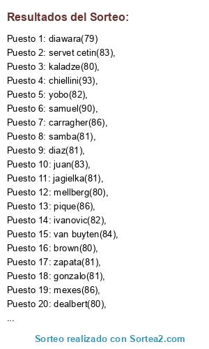 Lista de participantes: squillaci(84),, vermaelen(86),, dunne(84),, samba(81),, alex(84),, terry(87),, heitinga(81),, jagielka(81),, hangeland(82),, carragher(86),, toure(87),, company(87),, lescott(82),, ferdinand(85),, vidic(90),, brown(80),, coloccini(80),, campbell(82),, bramble(83),, gallas(87),, dawson(86),, king(80),, woodgate(83),, gamberini(84), kroldrup(80),, natali(82),, kaladze(80),, lucio(93),, ivan cordova(86),, samuel(90),, materazzi(81),, chivu(83),, barzagli(82),, bonucci(81),, chiellini(93),, nesta(87),, thiago silva(84),, legrottaglie(83),, yepes(81),, mexes(86),, juan(83),, zapata(81),, pique(86),, puyol(92),, Milito(88),, carvalho(84),, pepe(85),, albiol(81),, ujfalusi(82), diaz(81),, dealbert(80),, gonzalo(81),, escude(80),, M caceres(81),, demichelis(84),, van buyten(84),, mellberg(80),, rolando(80),, ferrari(80),, d lugano(82),, fabio bilica(82),, yobo(82),, servet cetin(83),, skrtel(79),, kiyrkiakos(80),, senderos(78),, distin(81),, ivanovic(82),, ciani(78),, planus(77),, cris(84),, diawara(79).