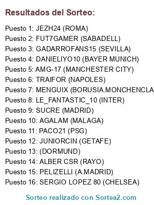 Lista de participantes: SUCRE (MADRID), TRAIFOR (NAPOLES), JUNIORCIN (GETAFE), AGALAM (MALAGA), MENGUIX (BORUSIA.MONCHENCLADBACH), ALBER CSR (RAYO), AMG-17 (MANCHESTER CITY), LE_FANTASTIC_10 (INTER), GADARROFANS15 (SEVILLA), (DORMUND), PELIZELLI (A.MADRID), FUT7GAMER (SABADELL), SERGIO LOPEZ 80 (CHELSEA), PACO21 (PSG), JEZH24 (ROMA), DANIELIYO10 (BAYER MUNICH).