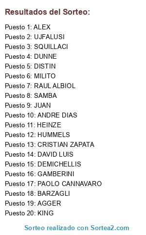 Lista de participantes: SAMBA, GAMBERINI, JUAN, UJFALUSI, DAVID LUIS, KING, BARZAGLI, SQUILLACI, MILITO, HUMMELS, ANDRE DIAS, DEMICHELLIS, DUNNE, RAUL ALBIOL, ALEX, DISTIN, CRISTIAN ZAPATA, PAOLO CANNAVARO, AGGER, HEINZE.