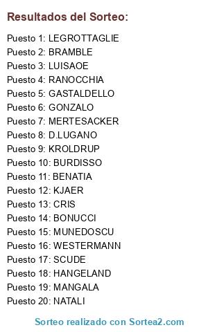 Lista de participantes: MERTESACKER, HANGELAND, RANOCCHIA, BENATIA, NATALI, LEGROTTAGLIE, MUNEDOSCU, WESTERMANN, D.LUGANO, BRAMBLE, BURDISSO, MANGALA, KJAER, LUISAOE, SCUDE, CRIS, GASTALDELLO, BONUCCI, KROLDRUP, GONZALO.