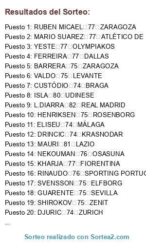 Lista de participantes: IZMAILOV 80 SPORTING PORTUGAL, GUARIN 80 OPORTO, GAITAN 80 BENFICA, JAVI GARCÍA 80 BENFICA, RIQUELME 80 BOCA JUNIORS, FELIPE MELO 80 GALATASARAY, DENISOV 80 ZENIT, KEITA 80 BARCELONA, HUGO VIANA 79 BRAGA, DEFOUR 79 OPORTO, FERNANDO 79 OPORTO, BELLUSCHI 79 OPORTO, ROBERTO CARLOS 79 MAKHACHKALA, DZAGOEV 79 CSKA, SAMEDOV 79 DINAMO MOSCU, CAMUÑAS 79 VILLAREAL, MARCOS SENNA 79 VILLAREAL, CANI 79 VILLAREAL, TROCHOWSKI 79 SEVILLA, RAKITIC 79 SEVILLA, BANEGA 79 VALENCIA, THIAGO 79 BARCELONA, JUANFRAN 79 ATLÉTICO DE MADRID, TIAGO 79 ATLÉTICO DE MADRID, VARGAS 79 FIORENTINA, PEDRO MENDES 78 VITORIA, VIERINHA 78 PAOK, INAN 78 GALATASARAY, MAKOUN 78 OLYMPIAKOS, EREMENKO 78 RUBIN KAZAN, KASAEV 78 RUBIN KAZAN, BYSTROV 78 ZENIT, ROSINA 78 ZENIT, SEMSHOV 78 DINAMO MOSCU, CARLOS MARTINS 78 GRANADA, DE GUZMÁN 78 VILLAREAL, DANI PAREJO 78 VALENCIA, A.COSTA 78 VALENCIA, PIATTI 78 VALENCIA, JAVI MARQUEZ 78 ESPANYOL, GRANERO 78 REAL MADRID, ADRIANO 78 BARCELONA, GABI 78 ATLÉTICO DE MADRID, DAVIS 78 RANGERS, KARA 78 TROMSO IL, BECKHAM 78 GALAXY, KUCKA 78 GENOA, NUNO ASSIS 77 VITORIA, AGUILAR 77 SPORTING PORTUGAL, ELIAS 77 SPORTING PORTUGAL, ANDRÉ SANTOS 77 SPORTING PORTUGAL, BRUNO CESAR 77 BENFICA, LETO 77 PANATHINAIKOS, YESTE 77 OLYMPIAKOS, KARADENIZ 77 RUBIN KAZAN, NOBOA 77 RUBIN KAZAN, TOSIC 77 CSKA, PEDRO LEÓN 77 GETAFE, BUONANOTTE 77 MÁLAGA, SERGIO CANALES 77 VALENCIA, ALBELDA 77 VALENCIA, XABI PRIETO 77 REAL SOCIEDAD, RUBEN MICAEL 77 ZARAGOZA, MARIO SUAREZ 77 ATLÉTICO DE MADRID, FERREIRA 77 DALLAS, KHARJA 77 FIORENTINA, SCHAARS 76 SPORTING PORTUGAL, RINAUDO 76 SPORTING PORTUGAL, RUBEN AMORIM 76 BENFICA, PÉREZ 76 BENFICA, SAQIRI 76 BASEL, MORENO 76 RACING CLUB, KARAGOUNIS 76 PANATHINAIKOS, GUDJOHNSEN 76 AEK ATHENAS, SEMAK 76 ZENIT, HUSZTI 76 ZENIT, DE ZEEUW 76 SPARTAK MOSCU, M. GONZÁLEZ 76 CSKA, MELIKSON 76 WISLA, VALERÓN 76 DEPORTIVO, GAVILÁN 76 GETAFE, DUDA 76 MÁLAGA, RAUL GARCÍA 76 OSASUNA, NEKOUMAN 76 OSASUNA, DE LAS CUEVAS 76 SPORTING GIJÓN, SUSAETA 76 ATHLETIC BILBAO, ALTINTOP 76 REAL MADRID, KAYAL 76 CELTIC, MORALES 76 REAL SALT LAKE, TAINIO 76 RED BULLS, GUBERTI 76 TORINO, CANDREVA 76 CESENA, JANKOVIC 76 GENOA, MESTO 76 GENOA, LJAJIC 76 FIORENTINA, LLAMA 76 CATANIA, LOBOS 75 TIGRES, LEANDRO SALINO 75 BRAGA, NOLITO 75 BENFICA, STOCKER 75 BASEL, HOFMANN 75 RAPID WIEN, NINIS 75 PANATHINAIKOS, KATSOURANIS 75 PANATHINAIKOS, P.GARCÍA 75 PAOK, DAVID FUSTER 75 OLYMPIAKOS, IBAGAZA 75 OLYMPIAKOS, JOAOZINHO 75 KRASNODAR, SHIROKOV 75 ZENIT, KOMBAROV 75 SPARTAK MOSCU, RAFAEL CARIOCA 75 SPARTAK MOSCU, ZAPATER 75 LOKOMOTIV, SVENSSON 75 ELFBORG, YEBDA 75 GRANADA, JUAN RODRÍGUEZ 75 GETAFE, LACEN 75 GETAFE, FARINÓS 75 LEVANTE, VALDO 75 LEVANTE, ISCO 75 MÁLAGA, ARMENTEROS 75 SEVILLA, GUARENTE 75 SEVILLA, MUNITIS 75 RACING SANTANDER, GURPEGUI 75 ATHLETIC BILBAO, ANDER HERRERA 75 ATHLETIC BILBAO, BARRERA 75 ZARAGOZA, PAULO ASSUNCÇAO 75 ATLÉTICO DE MADRID, COMMONS BORGES 75 CELTIC, BERRANTES 75 ALLESUNDS, FELLAH 75 VALERENGA, DRAGE 75 TROMSO IL, HOSETH 75 MOLDE, HENRIKSEN 75 ROSENBORG, DE ROSARIO 75 DC UNITED, PALOMBO 75 SAMPDORIA, PAROLO 75 CESENA, BIRSA 75 GENOA, ROSSI 75 GENOA, CONSTANT 75 GENOA, RICCHIUTI 75 CATANIA, ALMIRÓN 75 CATANIA, ZANETTI 80 INTER, STANKOVIC 80 INTER, SEEDORF 80 AC MILAN, MAGGIO 80 NAPOLES, INLER 80 NAPOLES, ISLA 80 UDINESE, COSSU 80 CAGLIARI, T.MOTTA 81 INTER, MAURI 81 LAZIO, AQUILANI 81 AC MILAN, MONTOLIVO 81 FIORENTINA, MIGUEL VELOSO 81 GENOA, KHEDIRA 81 REAL MADRID, BORJA VALERO 81 VILLAREAL, TOULALAN 81 MÁLAGA, MISIMOVIC 81 DINAMO MOSCU, HONDA 81 CSKA, ZHIRKOV 81 MAKHACHKALA, MCGEADY 81 SPARTAK MOSCU, CARLOS EDUARDO 81 RUBIN KAZAN, M.FERNANDEZ 81 SPORTING PORTUGAL, KRASIC 82 JUVENTUS, BOATENG 82 AC MILAN, L.DIARRA 82 REAL MADRID, JAVI MARTINEZ 82 ATHLETIC BILBAO, SERGIO BUSQUETS 83 BARCELONA, BERMUDEZ 74 ATLANTE, REYNA 74 AMÉRICA, GIMÉNEZ 74 CRUZ AZUL, CUSTÓDIO 74 BRAGA, FREN MÉRIDA 74 BRAGA, LUIS ALBERTO 74 NACIONAL, HUGO LEAL 74 VITORIA SETÚBAL, PEREIRINHA 74 SPORTING PORTUGAL, DJURIC 74 ZURICH, JUNUZOVIC 74 AUSTRIA WIEN, BATTAGLIA 74 BOCA JUNIORS, SAPINGIDIS 74 PAOK, ORBAIZ 74 OLYMPIAKOS, DRINCIC 74 KRASNODAR, ERMENKO 74 RUBIN KAZAN, NATKHO 74 RUBIN KAZAN, CARCELA-GONZÁLEZ 74 MAKHACHKALA, JUCILEI 74 MAKHACHKALA, AHMEDOV 74 MAKHACHKALA, OSILEH 74 CSKA, DANI BENITEZ 74 GRANADA, MICHEL 74 GETAFE, RUBEN SUAREZ 74 LEVANTE, S.FERNANDEZ 74 MÁLAGA, ELISEU 74 MÁLAGA, APOÑO 74 MÁLAGA, SHOJAEI 74 OSASUNA, TOPAL 74 VALENCIA, JORDI ALBA 74 VALENCIA, ANDRÉ CASTRO 74 SPORTING GIJÓN, NACHO CASES 74 SPORTING GIJÓN, RIVERA 74 SPORTING GIJÓN, ZURUTUZA 74 REAL SOCIEDAD, MARTÍ 74 MALLORCA, ROMARIC 74 ESPANYOL.
