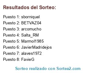 Lista de participantes: Marmol1985, Salta_RM, JavierMadridejos, BETVAZ04, sborniquel, alaves1972, arcomucho, FavieG.