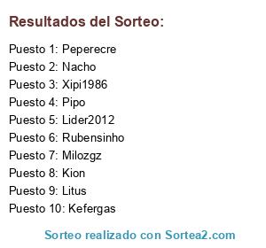 Lista de participantes: Kion, Litus, Sendeta, Chico, Kagaxin, Rubensinho, Milozgz, Xipi1986, Davidinho, Cadista, Karman, Lider2012, Kefergas, Alvarod91, Poni7, Nacho, Lucas8, Peperecre, Pipo, josehrbadia.