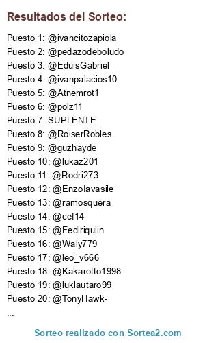 Lista de participantes: @ivancitozapiola, @leo_v666, @pedazodeboludo, @polz11, @EnzoIavasile, @damianpalav13, @mauromauro, @HBKleanHHH, @gerardo9982011, @Atnemrot1, @Fediriquiin, @ivanpalacios10, @ramosquera, @elcreidoluis, @Veniqueteatiendo, @TonyHawk-, @Rodri273, @fan2k44, @EduisGabriel, @ManNiko, @Waly779, @Kakarotto1998, @Tili_20, @juancamiloanichi, @luklautaro99, @RoiserRobles, @guzhayde, @lukaz201, @gabybravo, SUPLENTE, @mindmaster13, @cef14.