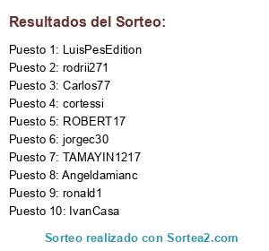 Lista de participantes: IvanCasa, LuisPesEdition, ROBERT17, Angeldamianc, jorgec30, rodrii271, Carlos77, ronald1, cortessi, TAMAYIN1217.