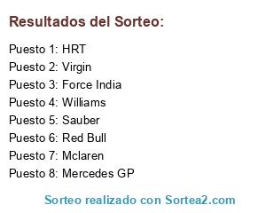 Lista de participantes: HRT, Mclaren, Virgin, Mercedes GP, Red Bull, Force India, Sauber, Williams.