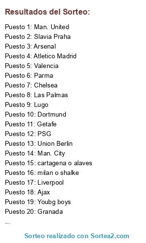 Lista de participantes: Arsenal, Burgos, Ajax, Leipzig, Slavia Praha, Getafe, Man. United, Atletico Madrid, Youbg boys, Valencia, Lugo, Parma, Liverpool, Dortmund, PSG, Chelsea, Union Berlin, Granada, Man. City, Las Palmas, milan o shalke, cartagena o alaves.