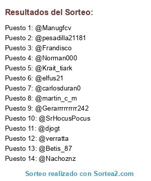Lista de participantes: @elfus21, @pesadilla21181, @martin_c_m, @Krait_tiark, @Manugfcv, @Betis_87, @Norman000, @verratta, @Nachoznz, @SrHocusPocus, @Frandisco, @carlosduran0, @Gerarrrrrrrrr242, @djogt.