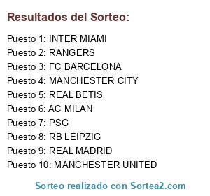 Lista de participantes: MANCHESTER CITY, MANCHESTER UNITED, BARCELONA, REAL MADRID, REAL BETIS, INTER MIAMI, RANGERS, MILAN, PSG, RB LEIPZIG.