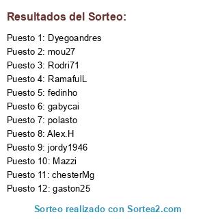 Lista de participantes: Alex.H, fedinho, jordy1946, chesterMg, RamafulL, Mazzi, gaston25, Rodri71, mou27, Dyegoandres, gabycai, polasto.