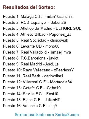 Lista de participantes: Athletic Bilbao - Papones_23, Atlético de Madrid - ELTIGREGOL, Elche C.F. - JulianHR, F.C.Barcelona - javict, Getafe C.F. - Cebo10, Levante UD - mono80, Málaga C.F. - milan10sanchiz, RCD Espanyol - Beken26, Real Betis - carloxdim1, Real Madrid - AsoLLs, Real Sociedad - chiscoviak, Real Valladolid - ismaeljimva, Rayo Vallecano - xFearlessY, Sevilla F.C. - Fosi10, Valencia C.F. - slq9, Villarreal C.F. - Mortadela84.