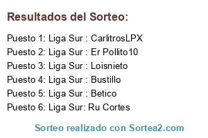Lista de participantes: Liga Sur : CarlitrosLPX, Liga Sur : Bustillo, Liga Sur : David180, Liga Sur : Sullen, Liga Sur : Osfranpong, Liga Sur : Er Pollito10, Liga Sur : Osdobla, Liga Sur : Maxisrael2005, Liga Sur : Betico, Liga Sur : Loisnieto, Liga Sur: Ru Cortes.