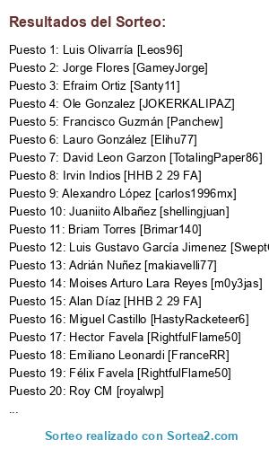 Lista de participantes: Briam Torres [Brimar140], David Leon Garzon [TotalingPaper86], Francisco Guzmán [Panchew], Félix Favela [RightfulFlame50], Israel Dzul Figueroa [armandochiva02], Moises Arturo Lara Reyes [m0y3jas], Irvin Indios [HHB 2 29 FA], Alexandro López [carlos1996mx], Ole Gonzalez [JOKERKALIPAZ], Luis Olivarría [Leos96], Roy CM [royalwp], Alan Díaz [HHB 2 29 FA], Luis Gustavo García Jimenez [SweptCarton4], Oscar Velazquez [shevaoscar7], Alberto Torres [ALTM19], Lauro González [Elihu77], Jorge Flores [GameyJorge], Esteban Gonzalez Lizarraga [estebanZ03], Adrián Nuñez [makiavelli77], Hector Favela [RightfulFlame50], Francisco Peñaloza Aguilar [paco25penaloza], Efraim Ortiz [Santy11], Miguel Castillo [HastyRacketeer6], Emiliano Leonardi [FranceRR], Javi Hernández [SpeakableNote51], Juaniito Albañez [shellingjuan].