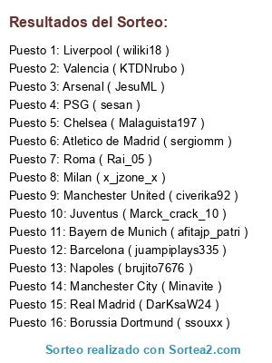 Lista de participantes: Borussia Dortmund ( ssouxx ), Bayern de Munich ( afitajp_patri ), Valencia ( KTDNrubo ), Juventus ( Marck_crack_10 ), Manchester United ( civerika92 ), Atletico de Madrid ( sergiomm ), Arsenal ( JesuML ), Real Madrid ( DarKsaW24 ), Milan ( x_jzone_x ), Liverpool ( wiliki18 ), Barcelona ( juampiplays335 ), Chelsea ( Malaguista197 ), Napoles ( brujito7676 ), Roma ( Rai_05 ), PSG ( sesan ), Manchester City ( Minavite ).