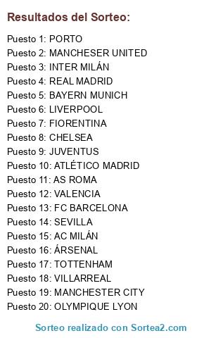 Lista de participantes: VILLARREAL, LIVERPOOL, BAYERN MUNICH, SEVILLA, VALENCIA, INTER MILÁN, FC BARCELONA, CHELSEA, AC MILÁN, ATLÉTICO MADRID, AS ROMA, ÁRSENAL, FIORENTINA, JUVENTUS, PORTO, REAL MADRID, MANCHESTER CITY, MANCHESER UNITED, TOTTENHAM, OLYMPIQUE LYON.