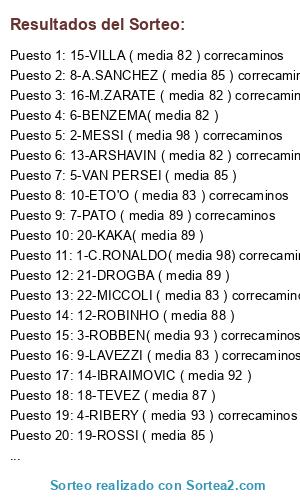 Lista de participantes: 1. CESC, 2. ARSHAVIN, 3. VAN PERSIE, 4. LAMPARD, 5. DROGBA, 6. TORRES, 7. GERRARD, 8. TEVEZ, 9. ROONEY, 10. LENNON, 11. ETOO, 12. CAMBIASO, 13. PIRLO, 14. ROBINHO, 15. IBRAHIMOVIC, 16. PATO, 17. CASSANO, 18. DAVID PIZARRO, 19. DE ROSSI, 20. TOTTI, 21. AGÜERO, 22. FORLAN, 23. PIQUE, 24. PUYOL, 25. DANI ALVES, 26. XAVI, 27. INIESTA, 28. MESSI, 29. VILLA, 30. PEPE, 31. CARVALHO, 32. SERGIO RAMOS, 33. CR7, 34. MARCELO, 35. XABI ALONSO, 36. OZIL, 37. HIGUAIN, 38. KAKA, 39. BENZEMA, 40. ROSSI, 41. AIMAR, 42. GAITAN, 43. MOUTINHO, 44. ROBBEN, 45. RIBERY, 46. SCHWEINTEIGER, 47. RIQUELME, 48. VERON, 49. DECO, 50. VAN DER VART, 51. SNEIJDER, 52. A.SANCHEZ.