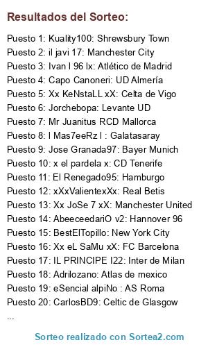 Lista de participantes: Hernan20: Rayo Vallecano, Panterjack: Villareal, il javi 17: Manchester City, Adrilozano: Atlas de mexico, Mr Juanitus RCD Mallorca, Jorchebopa: Levante UD, Sr Pistolas 86: Juventus, xXxValientexXx: Real Betis, Aguuu l7l: Sevilla FC, BaIIes: Ajax, l Mas7eeRz l : Galatasaray, CarlosBD9: Celtic de Glasgow, eSencial alpiNo : AS Roma, Xx eL SaMu xX: FC Barcelona, Jimmy Baek: Borussia Dortmund, Juanfran333: Malaga CF, IL PRINCIPE I22: Inter de Milan, zZzZ JONA zZzZ: Totteham, Ivan l 96 lx: Atlético de Madrid, AbeeceedariO v2: Hannover 96, x el pardela x: CD Tenerife, Jose Granada97: Bayer Munich, PuTTO ViiLa I: UD Las Palmas, Kuality100: Shrewsbury Town, Xx JoSe 7 xX: Manchester United, Xx KeNstaLL xX: Celta de Vigo, Andrew Torre: Real Sociedad, El Renegado95: Hamburgo, Carpier: Real Salt Lake, BUTR4666: Real Oviedo, Capo Canoneri: UD Almería, BestElTopillo: New York City.