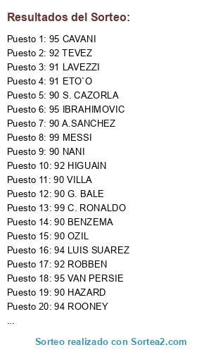 Lista de participantes: 99 C. RONALDO, 99 MESSI, 98 INIESTA, 96 AGUERO, 95 IBRAHIMOVIC, 95 VAN PERSIE, 95 CAVANI, 95 FALCAO, 94 ROONEY, 94 LUIS SUAREZ, 93 SILVA, 92 NEYMAR, 92 ROBBEN, 92 TEVEZ, 92 HIGUAIN, 91 ETO`O, 91 RIBERY, 91 ROBINHO, 91 LAVEZZI, 90 S. CAZORLA, 90 GIOVINCO, 90 DROGBA, 90 A.SANCHEZ, 90 HAZARD, 90 G. BALE, 90 BENZEMA, 90 VILLA, 90 OZIL, 90 NANI, 89 A. PATO, 88 BALOTELLI, 87 HULK.