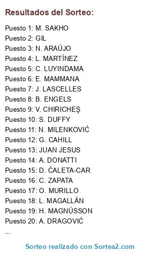 Lista de participantes: R. FUNES MORI, N. VIERGEVER, RODRIGO BECÃO, S. KRIVTSOV, HILTON, C. IZQUIERDOZ, S. DUFFY, A. DONATTI, C. HÉRELLE, GUSTAVO H., O. MURILLO, M. ŠKRTEL, L. DUNK, B. STAMBOULI, J. LASCELLES, C. ZAPATA, C. LUYINDAMA, B. ENGELS, N. MILENKOVIĆ, E. MAMMANA, L. MARTÍNEZ, GIL, LUÍS NETO, F. SCHÄR, RAFAEL TOLÓI, M. SAKHO, JUANPE, DAVID LÓPEZ, V. CHIRICHEŞ, VÍCTOR RUÍZ, ÁLVARO GONZÁLEZ, JUAN JESUS, L. MAGALLÁN, H. MAGNÚSSON, G. MANCINI, A. DRAGOVIĆ, S. GIGOT, L. TONELLI, G. CAHILL, B. MECHELE, N. ARAÚJO, LLORENTE, R. ARBOLEDA, M. ROJO, D. ĆALETA-CAR.