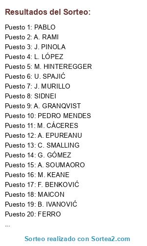 Lista de participantes: J. VESTERGAARD, Y. GÓMEZ, M. SUCHÝ, M. CÁCERES, U. SPAJIĆ, PABLO, NALDO, RODRIGO MOLEDO, B. KAMARA, PEDRO MENDES, M. KEANE, SIDNEI, A. MASIELLO, P. JONES, B. IVANOVIĆ, MAICON, J. MURILLO, L. LÓPEZ, Z. FEDDAL, T.KOLODZIEJCZAK, A. GRANQVIST, M. SARR, C. SMALLING, G. GÓMEZ, J. PINOLA, DANIEL CARRIÇO, S. AZIZ, M. HINTEREGGER, F. BENKOVIĆ, A. SOUMAORO, A. EPUREANU, A. RAMI, D. DA SILVA, J. EVANS, N. PALLOIS, IVAN MARCANO, FERRO.
