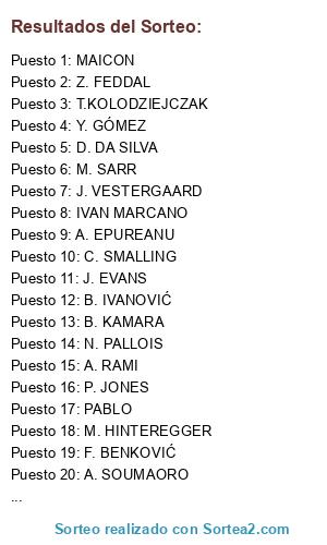 Lista de participantes: J. VESTERGAARD, Y. GÓMEZ, M. SUCHÝ, M. CÁCERES, U. SPAJIĆ, PABLO, NALDO, RODRIGO MOLEDO, B. KAMARA, PEDRO MENDES, M. KEANE, SIDNEI, A. MASIELLO, P. JONES, B. IVANOVIĆ, MAICON, J. MURILLO, L. LÓPEZ, Z. FEDDAL, T.KOLODZIEJCZAK, A. GRANQVIST, M. SARR, C. SMALLING, G. GÓMEZ, J. PINOLA, DANIEL CARRIÇO, S. AZIZ, M. HINTEREGGER, F. BENKOVIĆ, A. SOUMAORO, A. EPUREANU, A. RAMI, D. DA SILVA, J. EVANS, N. PALLOIS, IVAN MARCANO, FERRO.