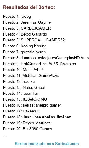 Lista de participantes: MatisPvP™, ThePuppet, lexer fran, Emiliano Burgueño Santibañez, Herny Gamer, gonzalo beron, Juan José Abellan Jiménez, felix gameplay, isai23 GAMER, hao xu, Bull8080 Games, Thomas Moya(2 participaciones), luxiog, Designer Lautielruso, BanYuKS, Koning Koning, NatsuIGneel, iStoryGamer, LuisHD-Gameplays-Vlogs- Tutos-Y ma, CARLCJGAMER, Divertime , (El Kul), ItzBetoxOMG, xtronyt el gamer y tuturial, JavierGamer YT, FELIPE DAVILA, Fakeeh G, manuel perez, Angel Uriel cartagena vazques, Jeremias Gaymer, JuanriosLosMejoresGameplayHD Amor A Los Cerdos, MrJulian GamePlays, WWE Español, Betox Gallardo, Pupinkpu YT, Mati_Gamer, SUPERGAL_ GAMER321, Marcos EVD, Dami Gamer, LinkGamerPro PvP & Diversión, WaffleGamesYT, Yerri Brine “Voorhees”, Reyes Martinez, sebastianelpro gamer.
