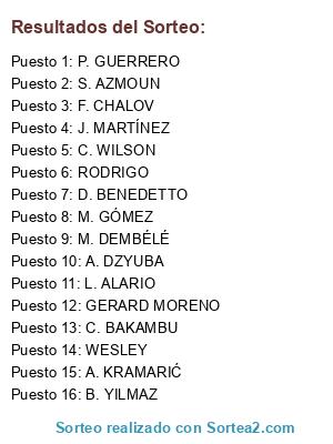 Lista de participantes: WESLEY, S. AZMOUN, M. GÓMEZ, P. GUERRERO, M. DEMBÉLÉ, RODRIGO, F. CHALOV, L. ALARIO, A. DZYUBA, GERARD MORENO, B. YILMAZ, J. MARTÍNEZ, C. BAKAMBU, C. WILSON, D. BENEDETTO, A. KRAMARIĆ.