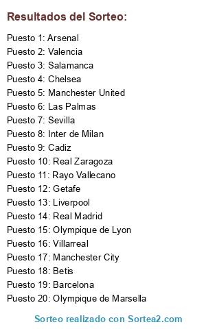 Lista de participantes: Salamanca, Betis, Arsenal, Cadiz, Real Zaragoza, Inter de Milan, Sevilla, Olympique de Lyon, Valencia, Getafe, Manchester City, Las Palmas, Liverpool, Barcelona, Chelsea, Manchester United, Olympique de Marsella, Villarreal, Rayo Vallecano, Real Madrid.
