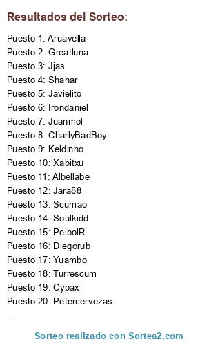 Lista de participantes: Greatluna, Yuambo, CharlyBadBoy, Dave13, Shahar, Davinchi, Xabitxu, Albellabe, Turrescum, Scumao, Javielito, Irondaniel, Jara88, Keldinho, Paradise, Petercervezas, Juanmol, Quirion, Cypax, PeibolR, Aruavella, Soulkidd, Jjas, Diegorub.