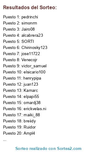 Lista de participantes: jose11722, JesusCelis, elsicario100, PC53, breiidy, maiki_88, Jairo08, omardj38, victor_samuel, Ampl4, Ruidor, Gerente sustituto, henrypipa, SORTI, Kamarc, juan123, Venecojr, elbiologo, simonrm, pedrinchi, alcabrera23, Chirinosky123, elpapi55, erickvelas.ni.