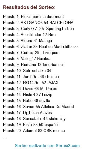 Lista de participantes: Malagueo99 BETIS, Ceutito 47 SAMPDORIA, Soccatala- 44 stoke city, Fista-88 50-español, RG1425 - 52- AJAX, AKTGANO8 54 BATCELONA, Bubo 38 sevilla, NisteR 37 Leizip, Xavier 55 Atlético De Madrid, Jordi25 - 36 chelsea, Zlatan 33 Real de Madriddttzzzz, Aleuru 31 Malaga, Cortex 29 - Liverpool, Carly777 -25. Sporting Lisboa, David 68 M. United, Dj_Luian Alaves, Angelete PSG, Seli schalke 04, Flekis borusia dourmunt, Valle_17 Basilea, Ferrari 77 Almeria, Romario 13 fenerbahce, Acostillador 12 Reus, Adumat 83 CSK moscu.