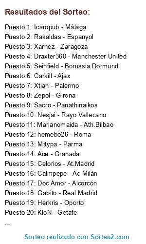Lista de participantes: Sacro - Panathinaikos, Carlossocio - Liverpool, Carkill - Ajax, Ayo - Las Palmas, Marcos - Stuttgart, Sukurpim - Real Sociedad, Seinfield - Borussia Dormund, Doc Amor - Alcorcón, Mttypa - Parma, Nesjai - Rayo Vallecano, Icaropub - Málaga, Deilik_buksson - Wolfsburgo, Calmpepe - Ac Milán, Rakaldas - Espanyol, Gabito - Real Madrid, Gustandril - Inter, Jordycf - Boca Juniors, Xtian - Palermo, Droigner - Arsenal, Xarnez - Zaragoza, Bart026 - PSG, Spirky360 - Napoles, Robmen360 - Barcelona, Celorios - At.Madrid, Ace - Granada, Modern 666 - Chelsea, Asier93 - Osasuna, Near10 - O.Marseille, Primito15 - Hercules, Dempseyr - Valencia, Marianomaida - Ath.Bilbao, 11_Jose_11 - Bayern Munich, Draxter360 - Manchester United, Pishu_ari - Manchester City, Zepol - Girona, hemebo26 - Roma, Abel_967 - Tottenham, KloN - Getafe, Lerida19 - Aston Villa, Herkris - Oporto.