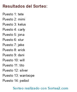 Lista de participantes: tito, jeke, carly, dani, erick, jona, kelus, mimi, peibol, silver, stur, tete, wantxope, will.