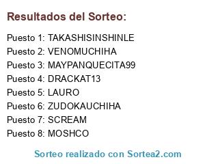 Lista de participantes: ROB, DEADSOUL, TZBUGSBUNNY, NUNET, DARKJO, TSURU, SALVADORMOZ, LAURO, EAGLEBLACK, KEVIN, SHADOW1024, PAPURRIUZUMAKI, SELUPACO, KUDOKIHADA, ELIORAMIREZ, DEMADAFAKA, DUVAN, AUSPICIADO1, HALION, WALDO, SEIWA, SCREAM, 7DARK7, SHIRAYUKI, MATATABI, RAIKAGE, VENOMUCHIHA, ROKUDAN, PUPOLAP, OBITOSANCHEZ, YOSHISUNEUCHIHA, TULIO, MOSHCO, LORDZEUSALTAIR, EVIRIS.