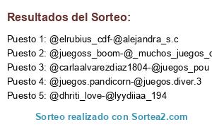 Lista de participantes: @juegos.pandicorn-@juegos.diver.3, @juegoss_boom-@_muchos_juegos_divertidos_, @elrubius_cdf-@alejandra_s.c, @carlaalvarezdiaz1804-@juegos_pou, @dhriti_love-@lyydiiaa_194.