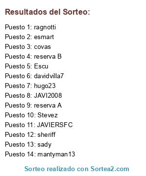 Lista de participantes: davidvilla7, covas, hugo23, Escu, sheriff, sady, Stevez, esmart, JAVI2008, JAVIERSFC, mantyman13, ragnotti, reserva A, reserva B.
