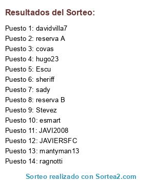Lista de participantes: davidvilla7, sady, Escu, sheriff, Stevez, JAVI2008, covas, JAVIERSFC, mantyman13, ragnotti, hugo23, esmart, reserva A, reserva B.