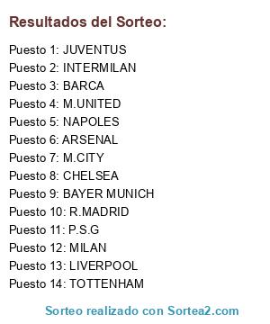 Lista de participantes: BARCA, R.MADRID, M.CITY, M.UNITED, P.S.G, INTERMILAN, MILAN, CHELSEA, JUVENTUS, BAYER MUNICH, LIVERPOOL, ARSENAL, NAPOLES, TOTTENHAM.