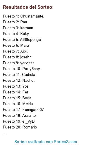 Lista de participantes: kagaxin, Party6boy, Cadista, karman, josehr, Meida, sgf92pes., yervisss, cokegol., joseliyo., Makiki., Xipi., Bit, Mara, Roberto, Pau, Fumigao007, Chustamante., el_VyD, Alejandro, Don_Patch, Romario, Kuky, Assalito, A69tepongo, Pipo, Borja, Yosi, Fer, Nacho., Eduardopro, Cata.