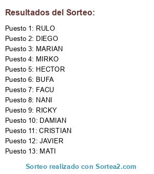 Lista de participantes: NANI, FACU, MATI, MARIAN, RIKI, MIRKO, BUFA, JAVIER, HECTOR, DAMI, DIEGO, CRISTIAN, RULO.