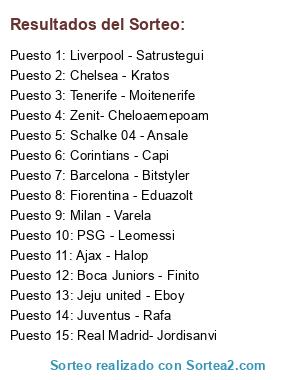 Lista de participantes: Zenit- Cheloaemepoam, Liverpool - Satrustegui, Jeju united - Eboy, PSG - Leomessi, Milan - Varela, Corintians - Capi, Tenerife - Moitenerife, Juventus - Rafa, Chelsea - Kratos, Fiorentina - Eduazolt, Barcelona - Bitstyler, Real Madrid- Jordisanvi, Ajax - Halop, Boca Juniors - Finito, Schalke 04 - Ansale.