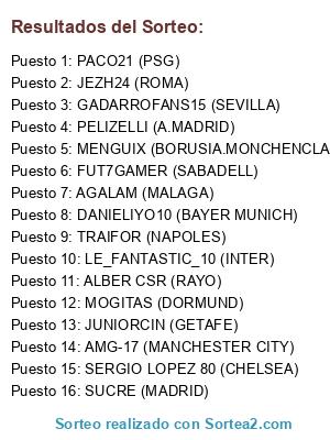 Lista de participantes: FUT7GAMER (SABADELL), MOGITAS (DORMUND), ALBER CSR (RAYO), LE_FANTASTIC_10 (INTER), AGALAM (MALAGA), PELIZELLI (A.MADRID), DANIELIYO10 (BAYER MUNICH), TRAIFOR (NAPOLES), PACO21 (PSG), MENGUIX (BORUSIA.MONCHENCLADBACH), SERGIO LOPEZ 80 (CHELSEA), SUCRE (MADRID), JEZH24 (ROMA), JUNIORCIN (GETAFE), AMG-17 (MANCHESTER CITY), GADARROFANS15 (SEVILLA).