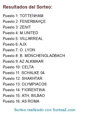 Lista de participantes: ATH. BILBAO, CELTA, VILLARREAL, M.UNITED, TOTTENHAM, SCHALKE 04, B. MÖNCHENGLADBACH, AS ROMA, FIORENTINA, O. LYON, SHAKHTAR, ZENIT, FENERBAHÇE, AJX, AZ ALKMAAR, OLYMPIACOS.