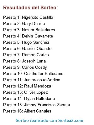 Lista de participantes: Wilfredo Martinez, Allen Suarez, Luis Andrade, Marco Saenz, James Bonilla, Delvis Gavarrete, Junior Andino, Fernando Espinoza, Jonathan Castillo, Cris Balladares, Felipe Navarro, Harold Torrez, Oscar Merlo, Alejandro Padilla, Paz Cuervo, Kevin Flores.