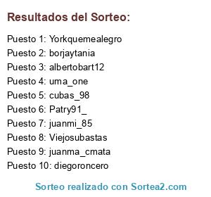 Lista de participantes: VictorJorge5, AlbaAyu, diegoroncero, cubas_98, juanma_cmata, uma_one, vanesa_hs, juanmi_85, AcevedoDaniel32, Patry91_, PolacoAdamski, piston_7, Viejosubastas, Yorkquemealegro, borjaytania, NadiaDeDinarber, nuriti25, Rocio_m8, albertobart12.