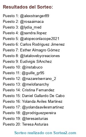 Lista de participantes: @acastanon2020, @alexstranger89, @astronomoking, @atopeconlacope2021, @avilesmartinezanabelen, @carlosmundo2015, @celiards, @cocinandotm6, @dgallardocabo, @elenass86, @estheralmagrogomez, @fernando0394, @guille_gr95, @instabuco, @laularedos, @lauracg76, @luciabc_07, @lydia_med, @maimacabas, @mariaserrano_22, @matildemartinezbaeza, @melofanarchy, @moroccanshopping, @nazaretserrano_2, @oseahello93, @prodriguezpereira, @raquicm85, @rosaaimaca, @ros_coco10, @sandra.llopez, @sandralopez3787, @sandralopezcalvo, @tatalovebycreaciones, @teresasturias, @vanessamarsan8, @vickycasas, @victoriaeugeniahernandezarnela, @yolandaavilesmartinez, Alfonso Martin Iglesias, Ana Belen Aviles Martinez, Ana Pin, Auxi Moreno, Carlitos Brown Madrid, Carlos Rodriguez Jimenez, Celia Rdsr, Cristina Fernandez, Daniel Gallardo De Cabo, Esther Almagro Gómez, Eudivigis SAnchez, Mara Bene, Marina AC, Markeziño ñañaña, Matilde Martínez Baeza, Mery Ddm, Nuria Mntrl, Raquel Conde Martinez, Rossy Aimacaña, Sunil Ramchandani, Teresa Asturias, Yolanda Aviles Martinez.