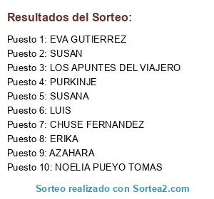 Lista de participantes: LAURA (LACOSAREVUELTA.ES), CHUSE FERNANDEZ, SUSANA, PURKINJE, SUSAN, ESTEFANIA, LOS APUNTES DEL VIAJERO, NOELIA PUEYO TOMAS, INMA, LUIS, EDUARDO, AZAHARA, GABRIEL, LAURA, EVA GUTIERREZ, ERIKA.